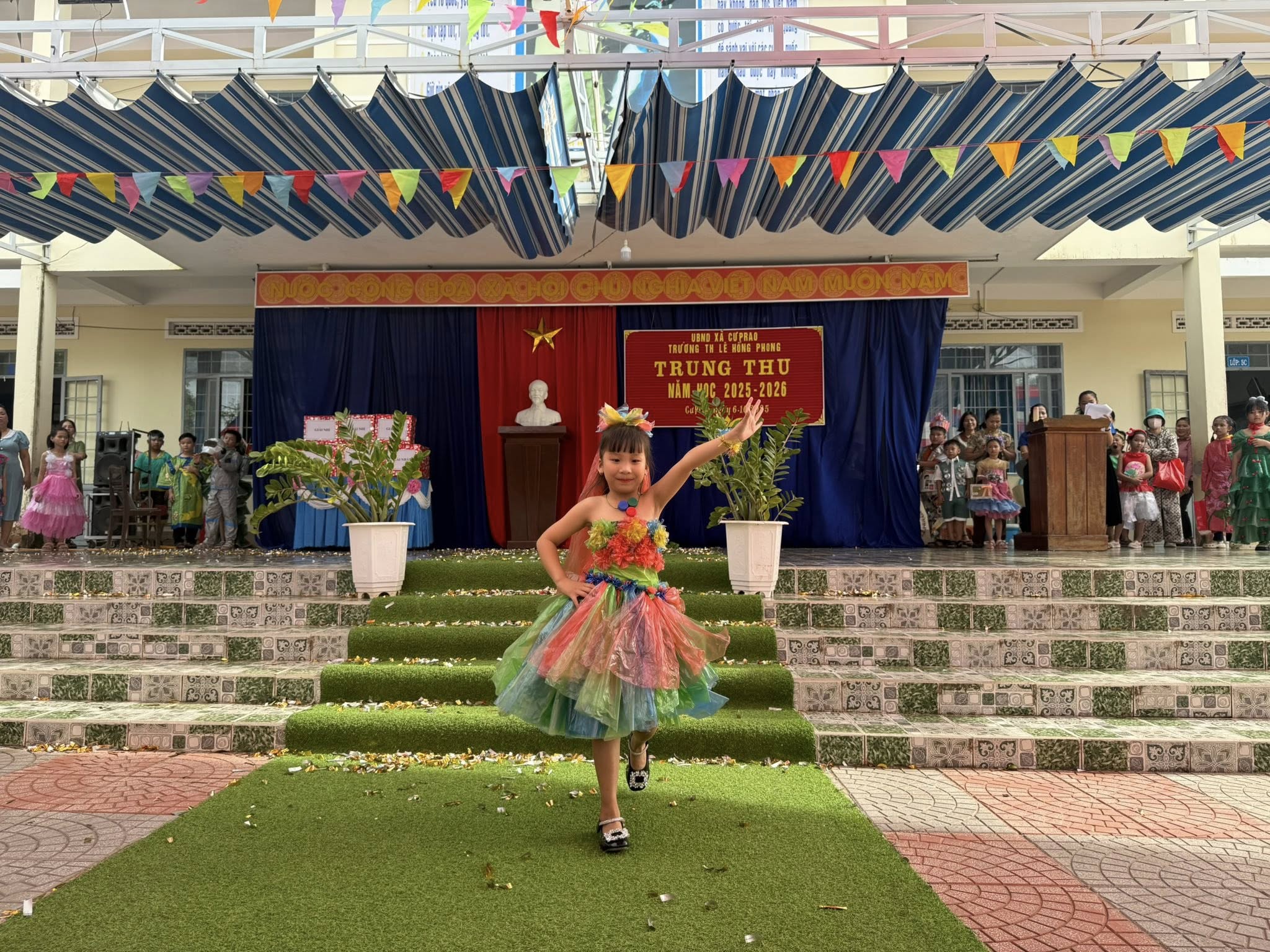 Phần được mong chờ nhất chính là hội thi trình diễn thời trang từ vật liệu tái chế. Các “người mẫu nhí” của Trường Tiểu học Lê Hồng Phong đã tự tin sải bước trên sân khấu trong những bộ trang phục đầy sáng tạo, được làm từ giấy, chai nhựa, túi nilon, báo cũ và nhiều vật liệu thân thiện với môi trường. Mỗi trang phục không chỉ thể hiện sự khéo léo, óc thẩm mỹ mà còn gửi gắm thông điệp ý nghĩa về bảo vệ môi trường và tái chế rác thải.